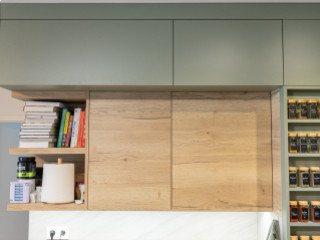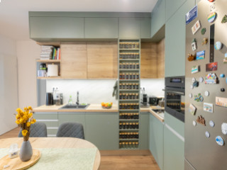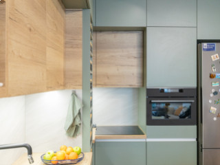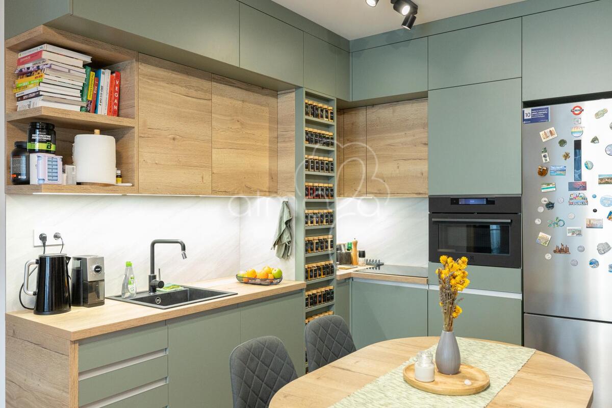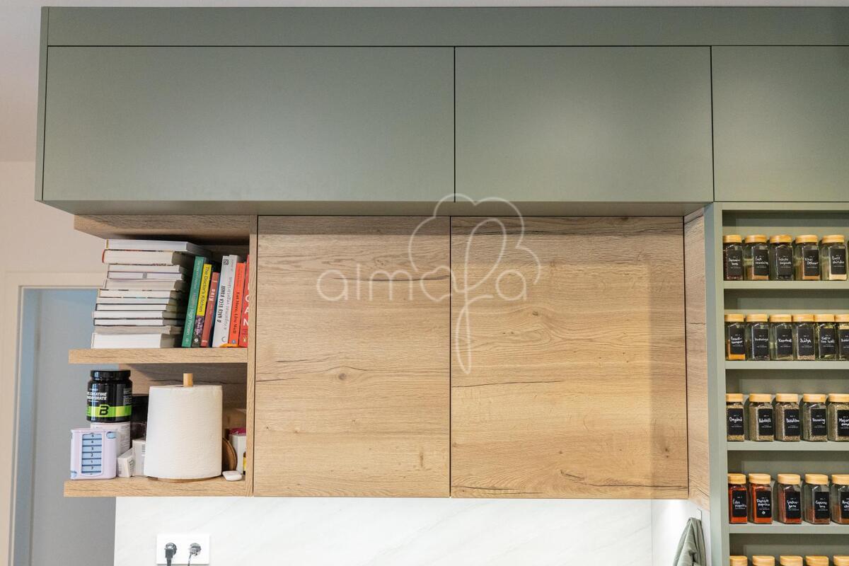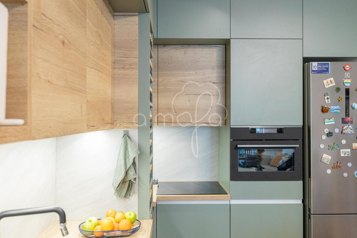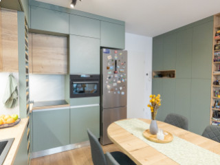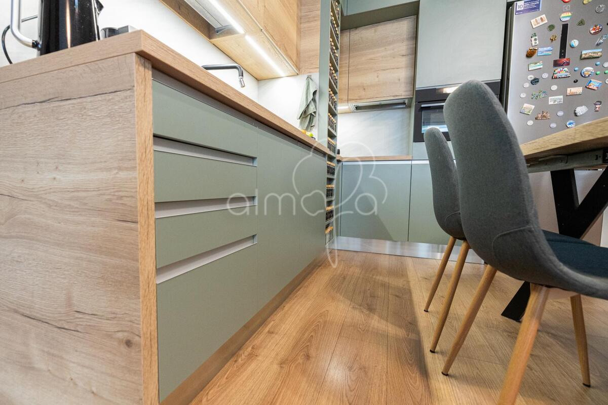 Zsályazöld és tölgy színű barna konyha harmóniája